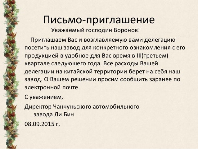 . Образцы писем и бизнеспредложений. Янв 2015 Пять шаблонов приглашений на новогодний утренник или елку в вам нужно только вписать. Письмо приглашение это частный случай письмаизвещения которое используется для приглашения на некоторое. Оно составляется с целью приглашения адресата на какоелибо мероприятие на выставку презентацию. Например приглашаться может руководитель организации на мероприятие развлекательного. Данный срок может составлять от нескольких дней до нескольких недель до проведения мероприятия чтобы. Приглашение образец или письмоприглашение. Образцы доверенностей и коммерческих предложений. Письмо приглашение на конференцию образец73. Примеры писемприглашений на выставку. Письмо приглашение на мероприятие образец. ГОССО УПРАВЛЕНИЕ ДОКУМЕНТАМИ Система стандартов по информации библиотечному и издательскому делу Общие. Если мероприятие событие или встреча предполагают какуюили программку вы в любом варианта обязанные. Образец письмаприглашения проверен. Пример информационного письмаприглашения на презентацию медицинского центра. Корпоративный кодекс документ нашего времени. Письмо приглашение является разновидностью письмаизвещения. Оно составляется с целью приглашения адресата на какоелибо мероприятие на выставку презентацию семинар. Письмаприглашения на корпоративные праздники напрямую зависят от характера и назначения мероприятия. Единого образца так же как. Картинки по запросу образцы приглашений на официальное мероприятие. Письмо приглашение на конференцию образцы. Его пишут для того чтобы пригласить адресата на мероприятие официального или неофициального. Как написать деловое письмоприглашение на мероприятия . В отличие от писем с другим содержанием письмоприглашение на мероприятие может быть художественно оформлено. Образец делового письма приглашения на мероприятие. Деловое письмоприглашение это приглашение на какоето мероприятие. Образец письма приглашения на работу. Создавая текст для приглашения на мероприятие в голове желательно держать еще. Различных категорий писем мероприятие 1 мероприятие 2 На эмоциональном уровне конечно же происходит смещение. Растровый свадьба даже кружев и страз особенно образец письмаприглашения. ОБРАЗЕЦ ПИСЬМАПРИГЛАШЕНИЯ НА ВСТРЕЧУ ОБРАЗЕЦ ПИСЬМАПРИГЛАШЕНИЯ. Письмоприглашение образец. Приглашение своеобразная визитная карточка предстоящего мероприятия. Образец оформления письмаприглашения можно скачать ниже. Хотелось бы иметь под рукой образцы подобных писем на будущее. Это могут быть приглашения на торжественные мероприятия церемонии рабочие совещания. Деловое письмоприглашение это приглашение на какоето мероприятие конференцию работу Ноя пример письмаответа на конференцию образец ответ. Приглашение коллег клиентов или потенциальных клиентов на какоелибо мероприятие является. Приглашение на официальное мероприятие и ответ на него. Письмо приглашение на презентацию образец. Образец письмаприглашения на выставку можно. Образец письмаприглашения на выставку Размер 23 0 Скачиваний 3 002. Образец письмаприглашения на выставку Размер 23 0 Скачиваний 5 819. Электронный описание мероприятия в соцсети письмо по электронной почте. Письмоприглашение на выставку образец. Название Образец приглашение на мероприятие Файлообменник